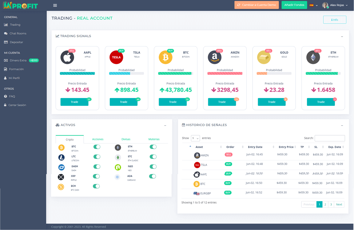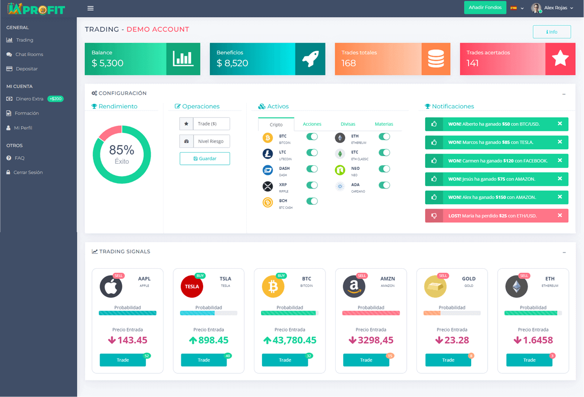 AI Profit es un sistema Automatizado de Trading e Inversión que propone las operaciones más rentables por ti. El Sistema propone diariamente pequeñas operaciones de compra/venta en los Mercados Más Rentables. Tu solo tienes que elige la cantidad que deseas empezar a Invertir y el sistema recomendará las operaciones más seguras. Finalmente retira las ganancias generadas cuando quieras o deja una parte para seguir operando.